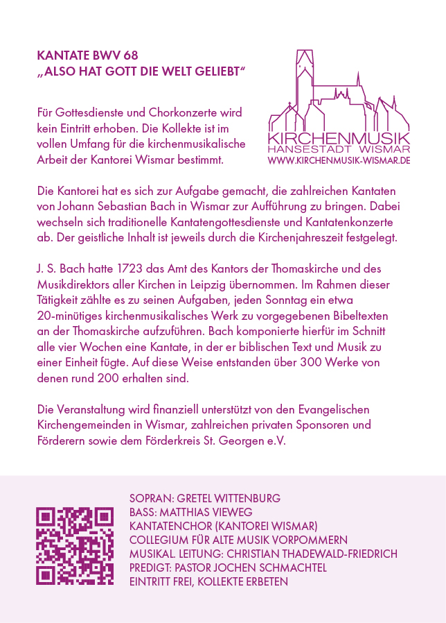 Im Zentrum steht die Kantate „Also hat Gott die Welt geliebt“ von Johann Sebastian Bach, die vom Kantatenchor der Kantorei Wismar, Solisten und dem Collegium für Alte Musik Vorpommern zur Aufführung gebracht wird. Die Gemeinde ist dabei ausdrücklich eingeladen, die Lieder und Choräle des Gottesdienstes mitzusingen – die Kantate selbst bleibt als musikalisches Werk den Ausführenden vorbehalten. So entsteht ein lebendiges Miteinander aus Zuhören und aktivem Teilnehmen.
